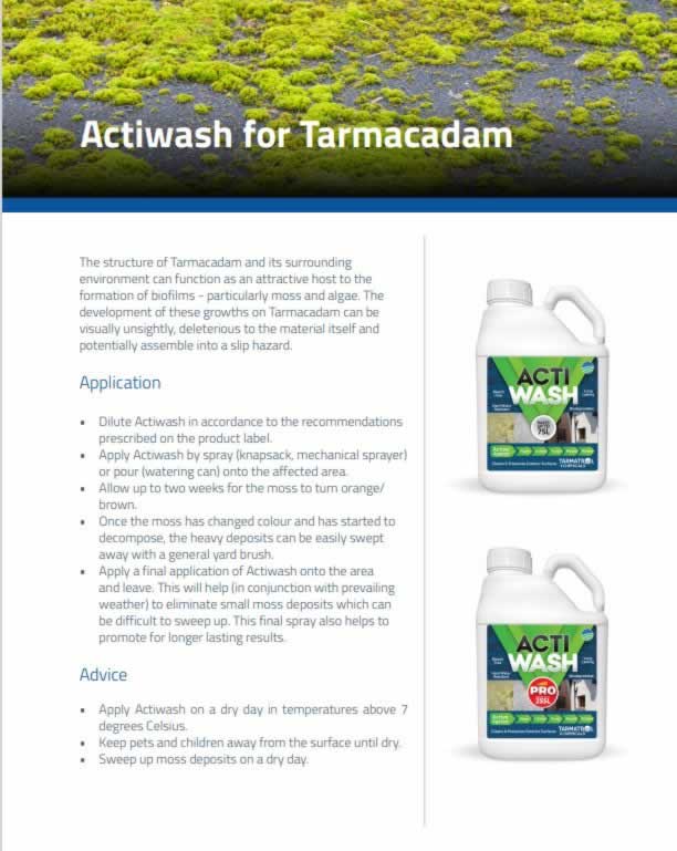 Actiwash Domestic is an efficacious and nearly pH neutral biocide suitable for the removal and control of unsightly organic (red, green and dark) staining found on many exterior surfaces. The powerful anti-microbial properties exhibited by the Actiwash formula slow down recontamination, thus providing lasting results. Actiwash is bleach-free and safe for use on virtually any natural or synthetic building surface. For professional users, we recommend Actiwash Pro.